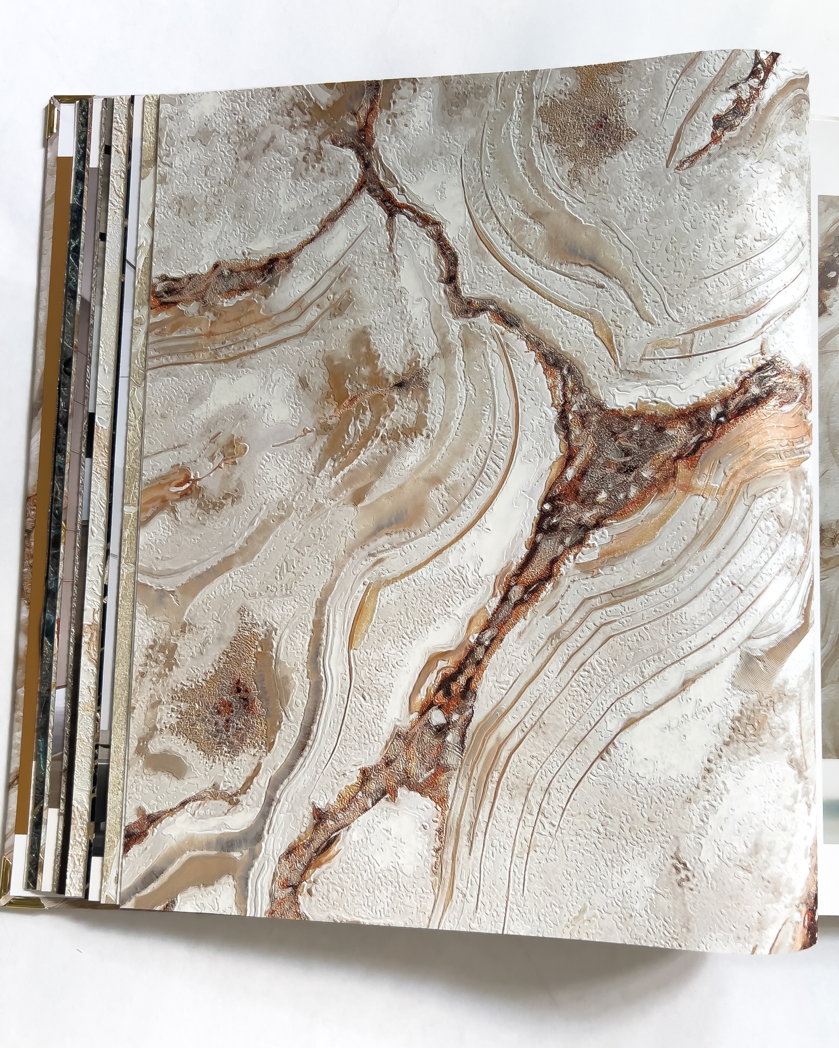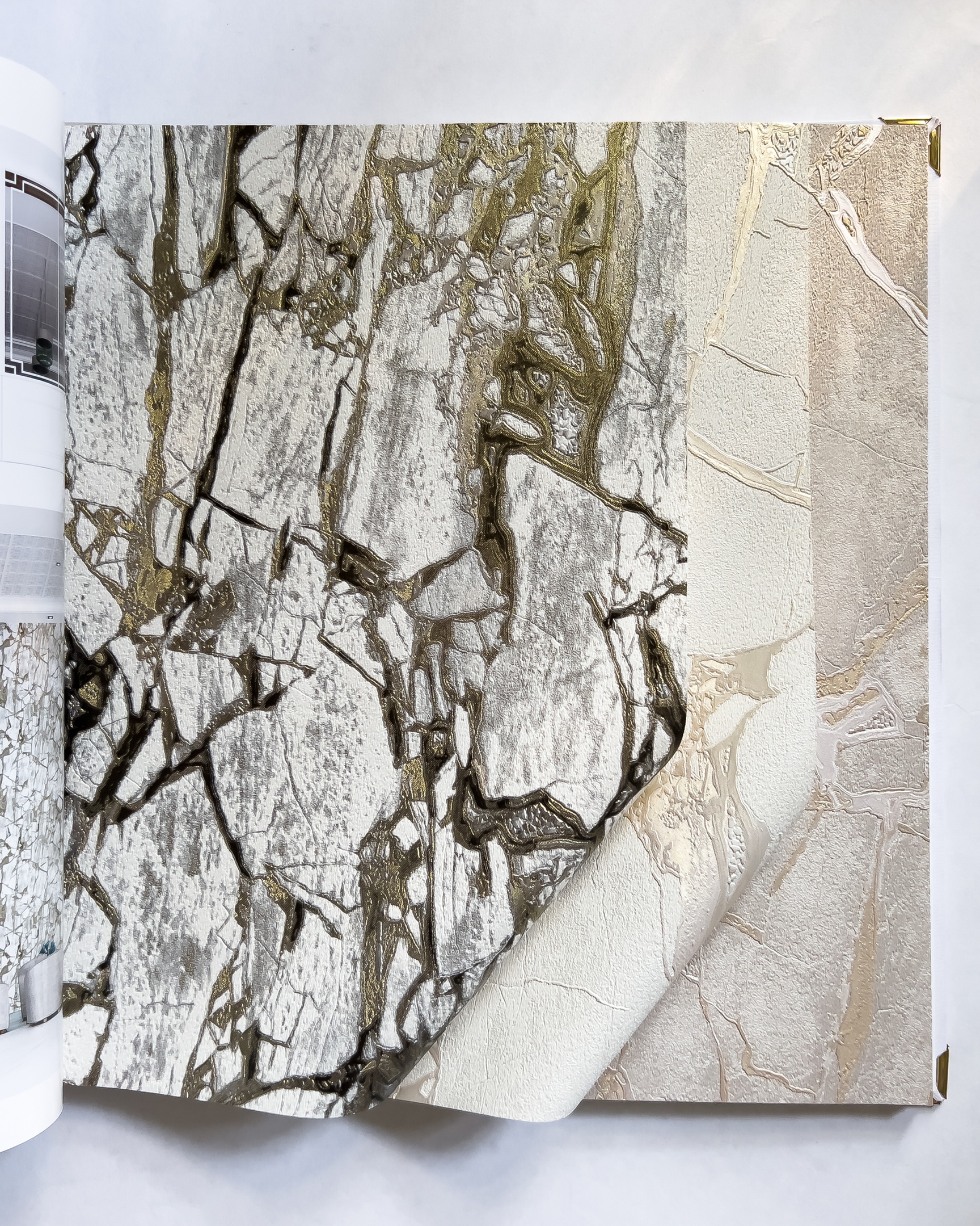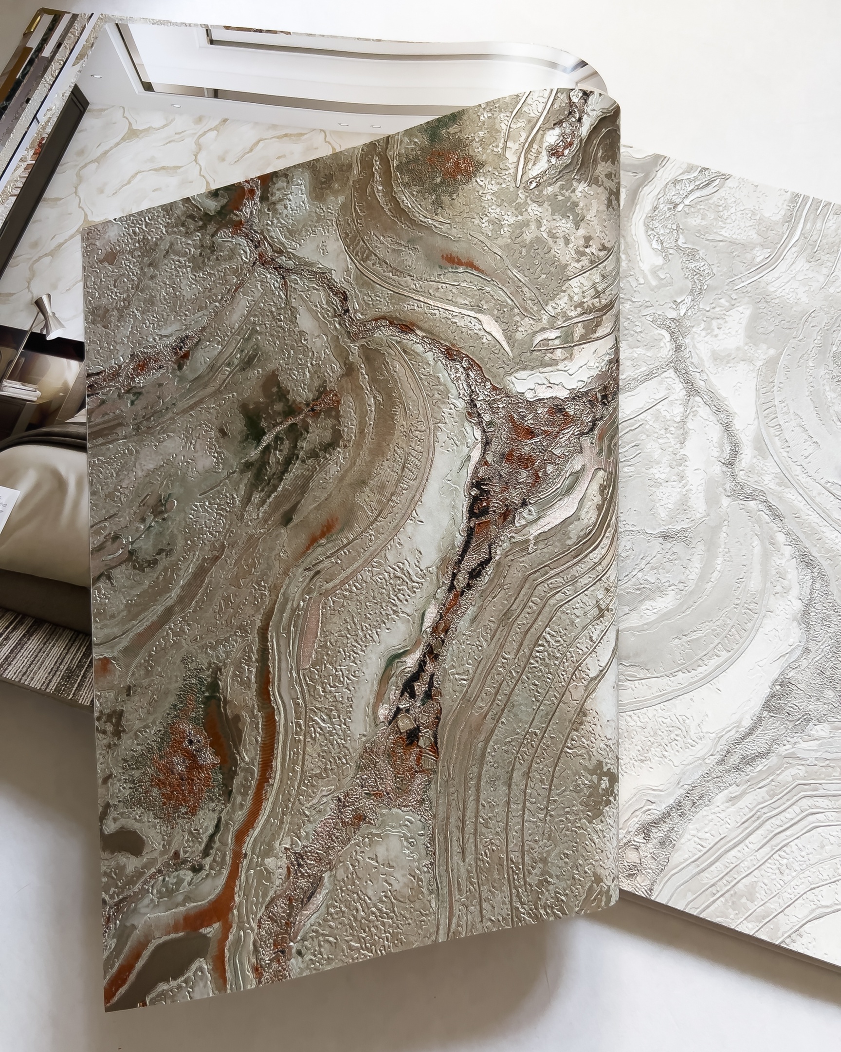 Carrara 3 — сочинение от фабрики Decori Decori на тему горных пород. Каррара — итальянский город, в котором добывают один из самых ценных видов мрамора в мире. Вдохновившись красотой камня, художники создали обои с ещё более богатой фактурой, сложным рисунком и сверкающими переливами. Минералы — продолжающийся тренд в дизайне интерьера и новая коллекция отлично вписывается в его рамки.