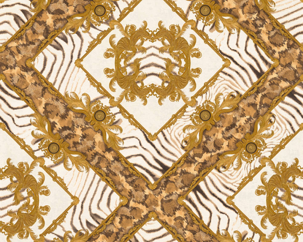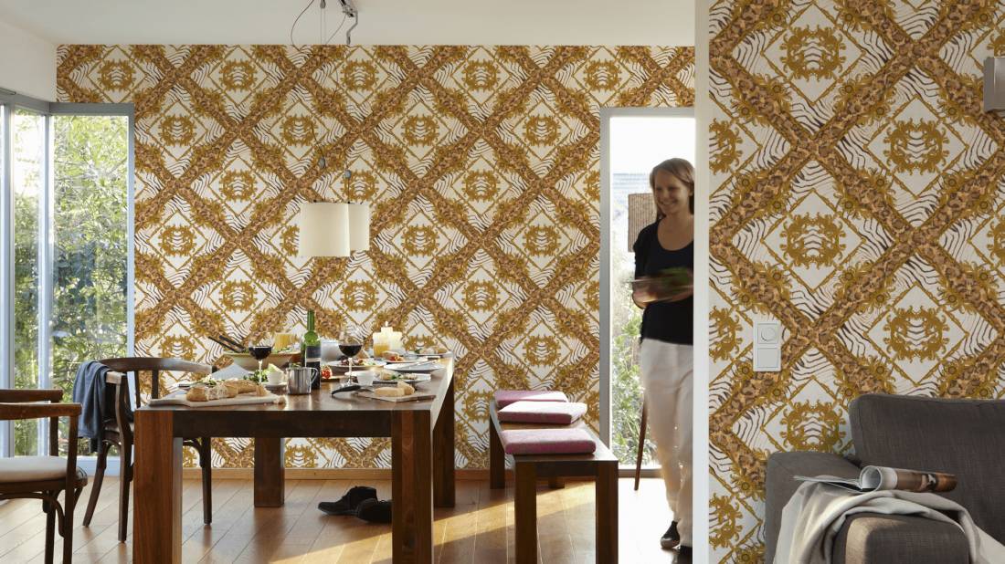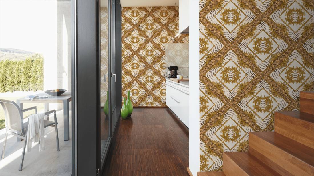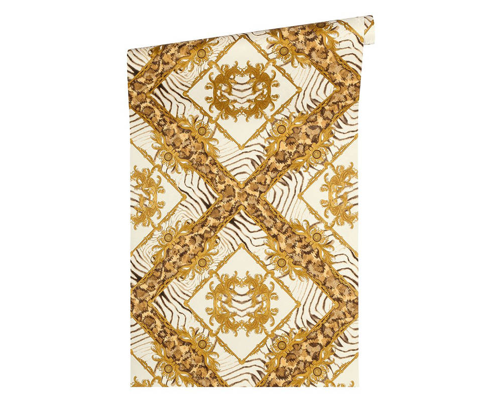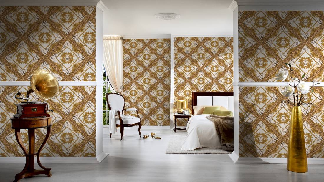 Великолепный набивной рисунок, много золота и дорогие материалы — это фирменный знак Versace, такой же, как и уже почти ставшие символом классики декоры Greek Key и Barocco.