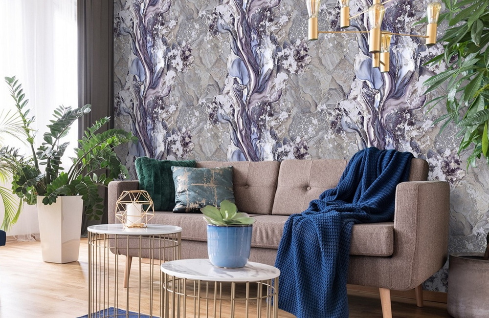 Sicilia от Victoria Stenova, мы уверены, станет хитом! По словам создателей коллекции, на реализацию идеи обоев с «мраморными» разводами и «звездной пылью» ушел год. Перед дизайнерами стояла задача создать «теплые» принты, несмотря на то, что обои имитируют холодные по сути материалы. Золотистое напыление было создано специально для коллекции Sicilia.