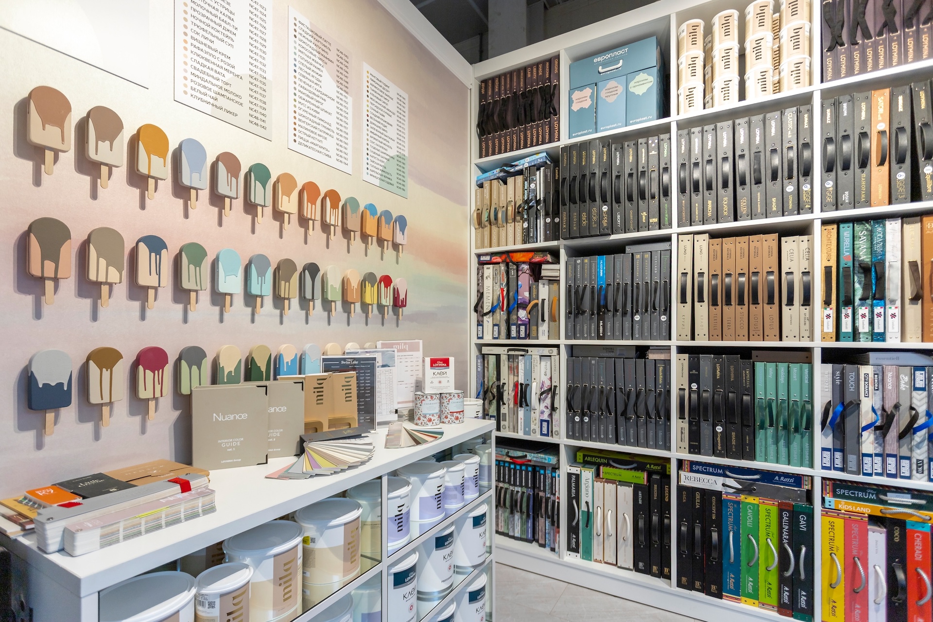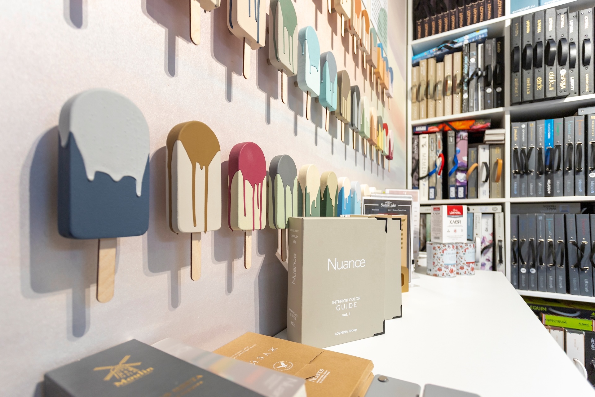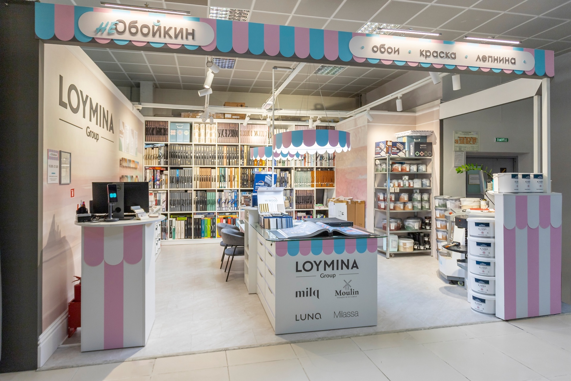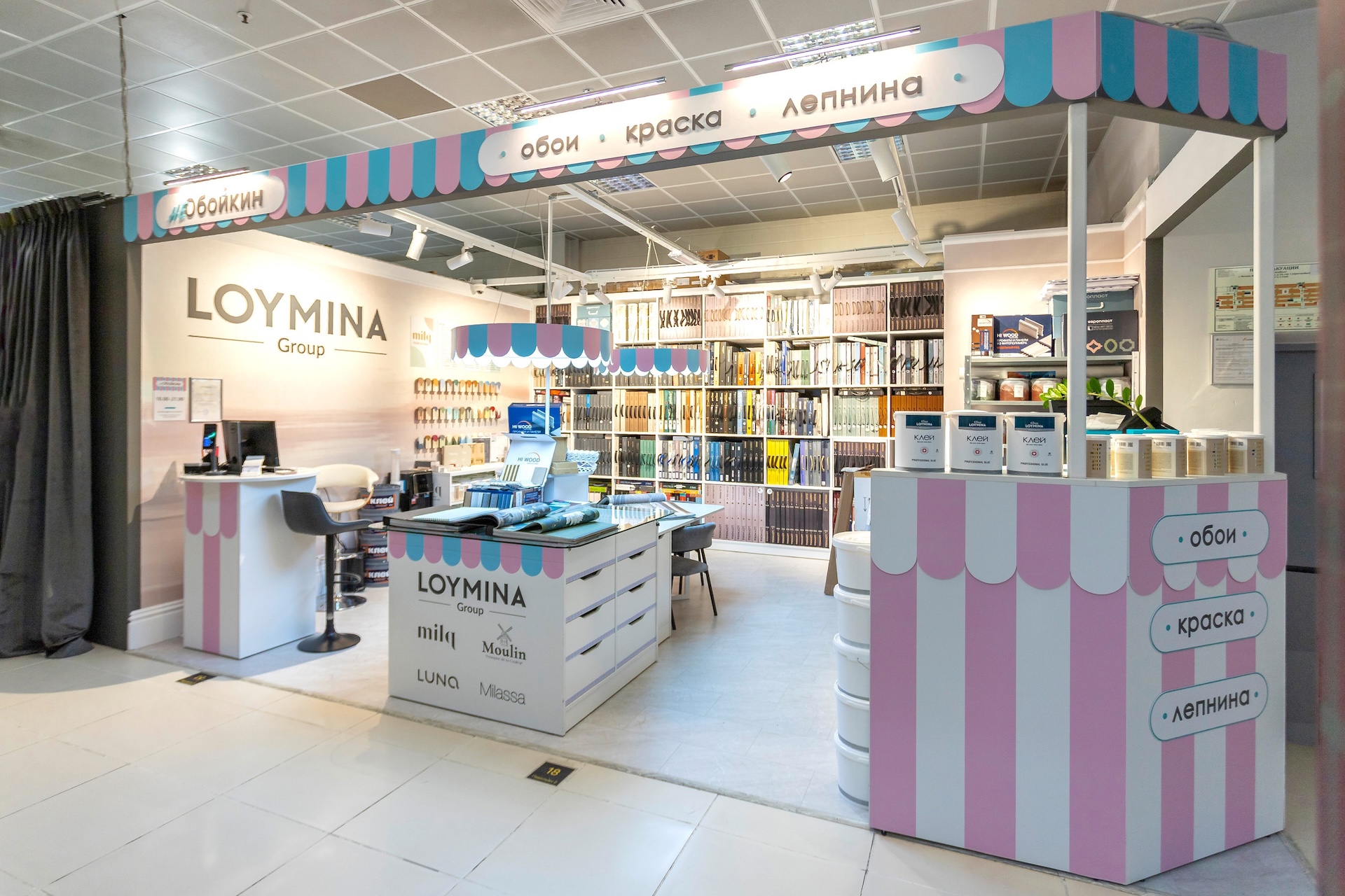 В оформлении фирменного магазина Loymina мы использовали отсылки к традиционному фургончику мороженщика с нежными голубыми и розовыми полосками. На эту сладкую тематику нас вдохновили оттенки красок Milq и Moulin, среди которых много карамельных и зефирных тонов.