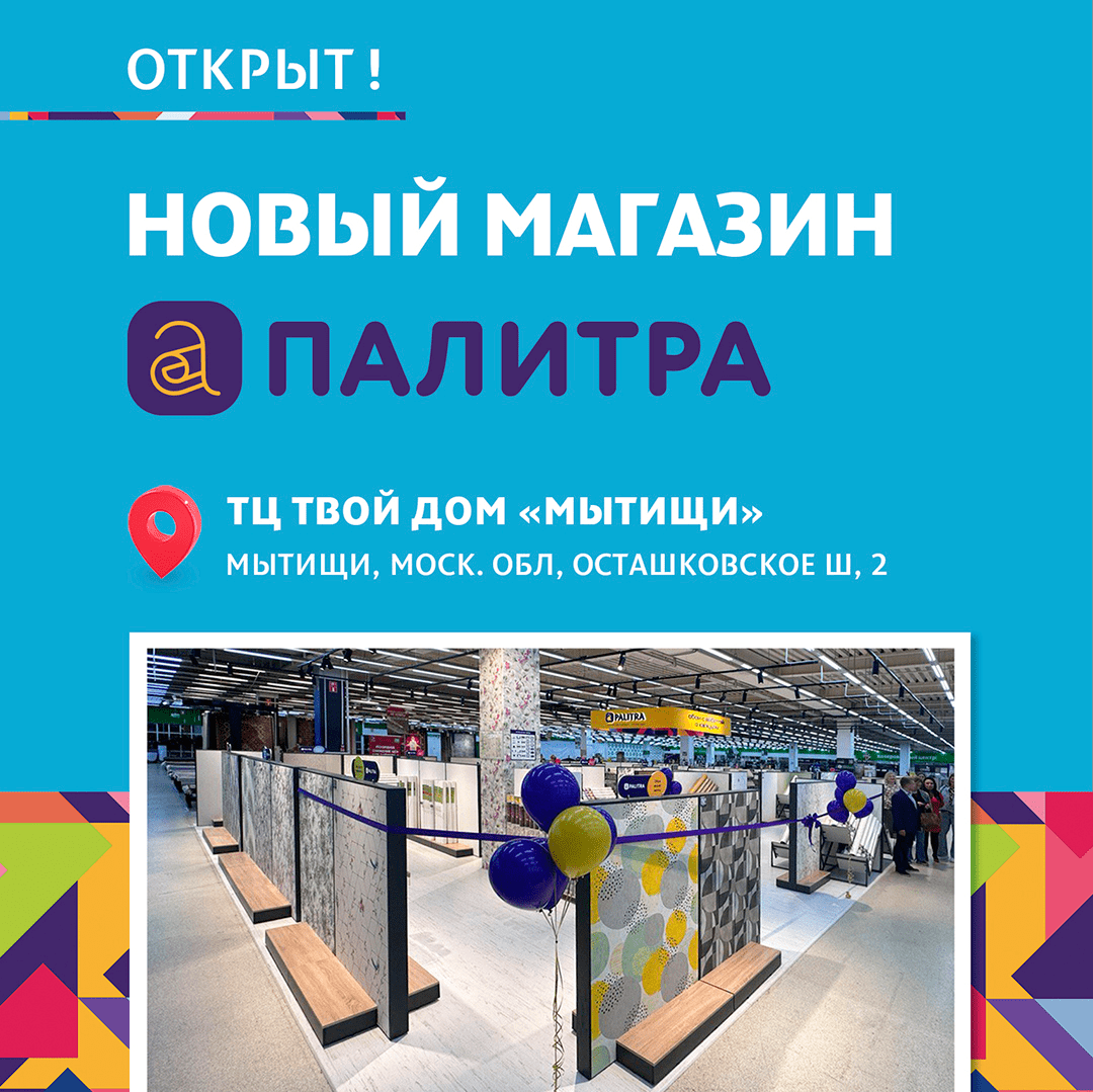 Мы открыли первый фирменный магазин в содружестве с фабрикой «Палитра»! Он расположился по адресу: Московская область, Осташковское шоссе, 2, ТЦ Твой Дом «Мытищи», по соседству с монобрендовым обойным центром Victoria Stenova.